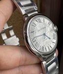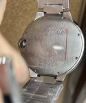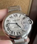 Cartier Blue Balloon series popular mechanical fully automatic men's watch 42.1mm oversized dial white sun-patterned dial black classic ancient Roman scale quenched and roasted blue sword-shaped hands with calendar display spinel sapphire crown fish-eye sapphire mirror equipped with Cartier mechanical fully automatic Cal.049 movement bottom cover steel stamped ID number 573289Qx clearly visible entire watch is completely original and unopened and unrepaired. The customer purchased it on July 28, 2025. The box, warranty card and certificate are complete and in nearly new and unused condition. The complete set is priced at 74750 at the counter and the spot price is 25850