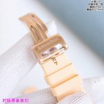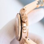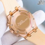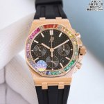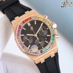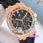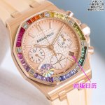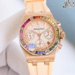 cle A unique rainbow bezel. Popular Audemars Piguet 37mm Royal Oak Offshore Chronograph. Celebrity-matched rainbow bezel limited edition. Sparkling precious gems collide with the classic octagonal case design to create a unique sparkle. The rainbow symbolizes optimism and romance, radiating captivating charm with every gesture, witnessing every romantic moment of life. This 37mm "Rainbow Bezel" features a rose gold case with an anti-glare sapphire crystal set with 32 rainbow-colored baguette-cut sapphires. The smoky rose gold dial features a "Lady Tapisserie" pattern, rose gold subdials, rose gold luminescent hour markers, and Royal Oak hands. Gems are arranged in a gradient color scheme. Rose gold pushers and a screw-down crown are paired with a beige rubber strap and a rose gold "Ap" folding clasp. Powered by the 7750 caliber, it offers a 40- hour power reserve and 50-meter water resistance. It also displays the chronograph, hours, minutes, small seconds, and date. Back cover coding synchronization counter K15973
