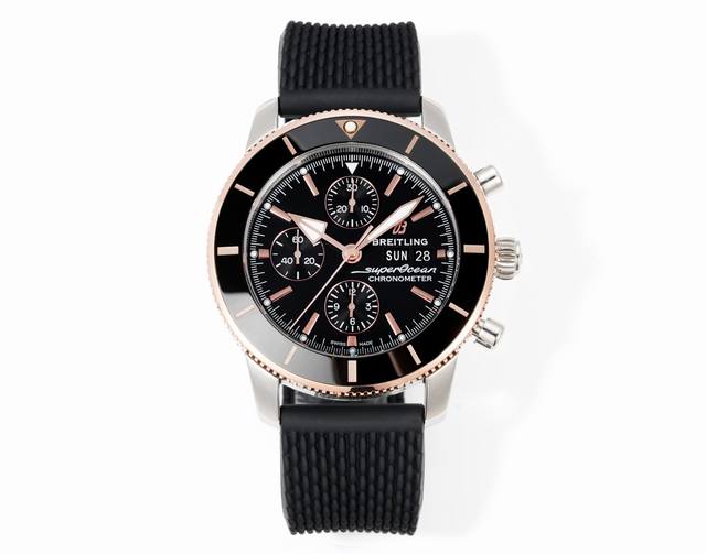 Bls Breitling Superocean Heritage II Limited Edition Chronograph Series. Breitling Superocean Chronograph 46 60 Years of Adventure and Discovery, born for modern explorers. Inheriting the 1957 model, on the 60th anniversary of the Superocean collection, a pioneer in deep-sea exploration, Breitling has revitalized this classic watch line while preserving its unique character. The all-new bezel design features stainless steel paired with an exceptionally durable, scratch-resistant, and shock-resistant high-tech ceramic bezel ring. The metal ring surrounding the minute scale has been eliminated, allowing the existing bezel to seamlessly blend with the dial, which is adorned with the original, classic brand logo. The addition of a double-sided anti-glare sapphire crystal is a highlight of this new model, and the addition of a panda counter further enhances the allure of the new Breitling Superocean Heritage II Chronograph. The three contrasting function dials are located at 3 o'clock, 6 o'clock and 9 o'clock, corresponding to the three conventional timing functions of 30-minute timing, 12-hour timing and small seconds, with a unique classic mechanical beauty. The triangular hour hand, diamond minute hand and the end of the tapered hour scale have Super-Luminova luminous parts, which are convenient for viewing time at night. There is a calendar display window between four and five o'clock on the dial, adding practical functions to this classic dial. The original movement is paired with Breitling's homemade movement. We use the most stable 7750 fish scale pattern washing movement in China. Each movement is tested for 48 hours before leaving the factory. The strap is equipped with a new cowhide-rubber strap of the same color dedicated to this series. It is sewn with contrasting stitching and has a strong sense of design. It is very comfortable to wear. The original mold of the Milanese steel strap is complex. All places are synchronized with the original, and the strap can be removed by screws