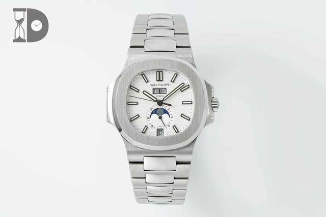 Factory Patek Philippe's sporty and elegant Nautilus Steel King Nautilus Annual Calendar watch, model 5726, is a superb replica. After a year and a half of research and development, this watch features a functionally identical, integrated 324 S Qa Lu single-speed movement, enabling independent slow and quick adjustment of the moon phase, day of the week, month, and calendar. The crown, however, only adjusts the time. Dimensions, appearance, and materials are identical, making this a rare replica of the annual calendar complication, featuring four fully adjustable buttons. Details are as follows: 1. Movement features: First, the true moon phase disc at 6 o'clock rotates once a month, simulating the original's 24-hour hand function. The moon phase can be quickly adjusted by pressing a hidden button at 8 o'clock. Second, the calendar position at 6 o'clock matches the original, essentially matching the inner shadow of the octagonal bezel. Crucially, the adjustment function remains the same as the original, allowing for quick adjustment of the calendar via a hidden crown at 4 o'clock , rather than the traditional knob. Third, a hidden button at 8 o'clock quickly adjusts the day of the week display, and a hidden button at 2 o'clock quickly adjusts the month display, identical to the original. All of these functions automatically advance over time.