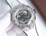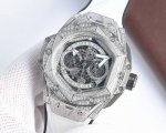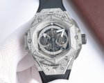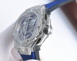 Hublot's new Big Bang Sang Bleu II T-Diamond Tattoo watch, once again collaborating with renowned tattoo studio Sang Bleu, presents the Tattoo Ll watch, a model ingeniously crafted with geometric motifs. This model perfectly embodies the brand's ambition and design philosophy. The Tattoo Ll utilizes refined lines to create a vivid three-dimensional visual experience. The 45mm case diameter features graphic elements that run through the case and are integrated into the hexagonal bezel through cutting and engraving. Six H-shaped titanium screws secure the bezel. The lugs feature a striking design, with steep angles and strong lines. The dial's most striking features are the diamond-shaped hour and minute hands and the two hexagonal dial hands, creating a unique geometric pattern as the time passes. The black rubber strap also uses geometric lines to create a three-dimensional visual experience. Easy-to-use folding clasp, titanium inner film, satin hollow hands, anti-reflective multi-faceted sapphire glass mirror that will never scratch, imported fluororubber strap makes it more comfortable to wear.