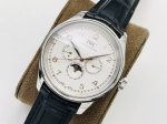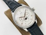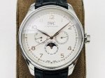 Iws Factory highly recommends the V2 upgraded version of the Portuguese series True Perpetual Calendar, the world's first perpetual calendar. It utilizes an imported Grand Seiko movement, upgraded to a replica of the 82650 caliber. Not only does it offer most of the perpetual calendar's functions, it also maintains stable timekeeping and has an extremely low repair rate, making it a rare and durable complication on the market. Reasons to buy: 1. Adjustments via hidden pushers in the case: The sun, moon, and date at 3 o'clock and 9 o'clock all operate normally and can be adjusted manually. The date can be adjusted via a hidden pusher at 4 o'clock, the day of the week at 8 o'clock, and the day of the week can be adjusted by the hand. 2. Exquisite craftsmanship, both inside and out. The case and strap are molded using CNC equipment in Germany and individually quality-checked. Every surface finish and chamfering are virtually indistinguishable from the original. The movement text and font layout are identical to the original, and the fish scale and graining details are exquisitely polished. The arched, scratch-resistant mirror mirror is as transparent as the original. The