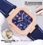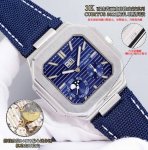 Highlights: Functional date display, week display, and moon phase are all real functions. Movement: Equipped with a modified 240ps eccentric mini-hammer, the movement is stable. Strap: Customized denim-grain calfskin on the surface and folding buckle with original buckle style. A 0.02 carat square diamond is set at the six o'clock position of the case as a low-key highlight. Sapphire mirror glass, case : size 45 mm, thickness 11 mm, which is the diagonal length of the case from 10 o'clock to 4 o'clock. Because the case is approximately square, the width of the upper and lower sides will be less than this value, so the visual effect is not very large. Welcome to appreciate it.