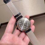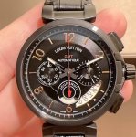 Lv Lv Louis Vuitton Tambour Evolution Chronograph Style Features: Rugged and masculine Movement: Imported running-second quartz movement Size: 43mm Thickness: 16mm This exceptionally well-designed chronograph features a perfectly polished stainless steel case and an avant-garde black metal composite bezel that contrasts with the crown and strap. This men's watch has been highly praised by the industry.