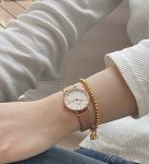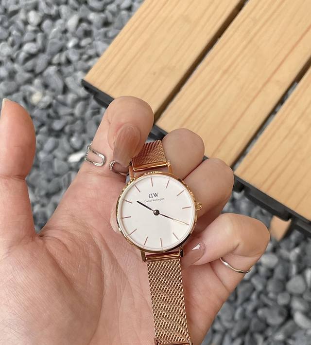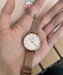 . The full name of the watch is Dw Moonlight White Gold Watch. The white dial and gold strap are combined together, which is a very high-end color combination. It also came with a Dw 520 limited edition pink jewelry box. It