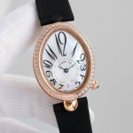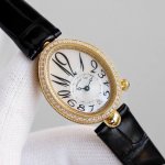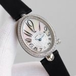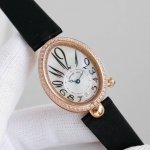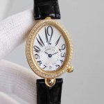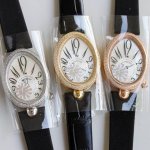 case is an ovoid shaped case with a fluted edge. Crafted from 316 stainless steel, plated with 18K yellow gold and rose gold, the bezel is set with brilliant-cut diamonds, and the crown is adorned with a faceted pear-shaped diamond. The caseback is engraved with digital codes using advanced laser technology, creating a rich, three-dimensional effect. The case measures 36.5 x 28.45 mm and is water-resistant to 30 meters. The dial is crafted from natural white mother-of-pearl from Tahitian, engine -turned, with an off-centered chapter ring at 6 o'clock and Breguet Arabic numerals. A faceted, flat-cut pear-shaped diamond adorns the 6 o'clock position, creating a dazzling display. The hands are set in classic blued steel. The movement is equipped with a self-winding mechanical movement, Calibre 5373, and boasts a 48-hour power reserve. The strap is made of lustrous Italian cowhide and comes with an original Breguet folding clasp, set with brilliant-cut diamonds. Look for exclusive quality.