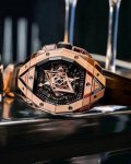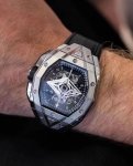The Hublot Big Bang Sang Bleu III: Three Generations of Tattoos, Each One More Brilliant. Measuring 42mm in diameter, the watch features a tonneau-shaped, multifaceted structure, further enhancing its three-dimensional effect.