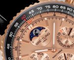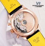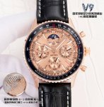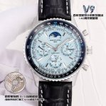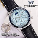 The white gold V9 Breitling Navitimer series launches its 140th anniversary limited edition, equipped with the revolutionary in-house B19 movement, a replica of the imported Seiko Nh36 movement with enhanced functionality, offering stable timekeeping and a low repair rate. This is a rare and durable complication watch in the replica market. The sun, moon, and star dials are positioned at 3 o'clock, the month at 6 o'clock, and the day of the week at 9 o'clock. The date can be manually adjusted clockwise by pulling out the second gear, the month via a hidden push-button at 8 o'clock, and the day of the week via an adjustable hand. The 12 o'clock star dial is synchronized with the original, completing one full rotation per month. Dimensions: 43mm x 14mm.