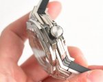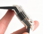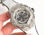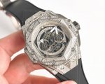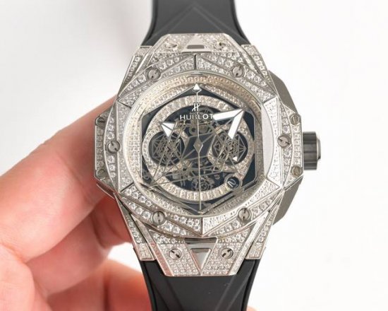 Hublot's new Big Bang Sang Bleu II T-Diamond Tattoo watch, once again collaborating with renowned tattoo studio Sang Bleu, presents the Tattoo Ll watch, another model ingeniously crafted with geometric motifs. This model perfectly embodies the brand's ambition and design philosophy. The Tattoo Ll utilizes refined lines to create a vivid three-dimensional visual experience. The 45mm case diameter features graphic elements that run through the case and are integrated into the hexagonal bezel through cutting and engraving. Six H-shaped titanium screws secure the bezel. The lugs feature a striking design, with steep angles and strong lines. The dial's most eye-catching features are the diamond-shaped hour and minute hands and the two hexagonal dial hands, creating a unique geometric pattern as the time passes. The black rubber strap also uses geometric lines to create a three-dimensional visual experience. Easy-to-use folding clasp, titanium inner film, satin hollow hands, anti-reflective multi-faceted sapphire glass mirror that will never scratch, imported fluororubber strap makes it more comfortable to wear.