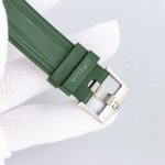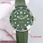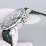 . The hands are coated with Super-Luminova, offering a blue-green luminescent finish. The minute hand displays green luminescent indicators, complemented by a green luminescent dot on the bezel for oxygen countdown. The dial design matches the counter-branded Seamaster 300 ceramic dial, creating a visually stunning finish that surpasses that of standard hydraulic pressure watches. The