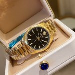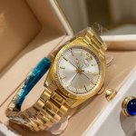 Gold Versace Millenyium Lady watch, featuring the brand's iconic Medusa and Versace logo at 12 o'clock on the case, exuding power and sophistication. The inner dial, bezel, and metal ring are engraved with the Greca pattern, showcasing an elegant design. All Versace watches bear the "Swiss Made" mark. All stainless steel is recycled. Case: Stainless steel case with Greca pattern on the bezel. Dial: Green guilloch