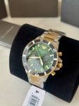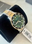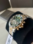 The two-tone design with gold plating and a jewel-like buckle exudes exceptional quality. The silver-white case complements the rotating gold-green bezel, while the deep green sunburst dial is striking. Luminous sword-shaped hands and markers ensure clear readability day and night.