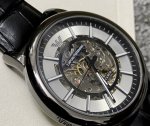 . Automatic mechanical skeleton watch with a light luxury and fashionable style. It possesses a unique aesthetic beyond mere functionality. The intricate internal structure showcases the beauty of mechanics, while the simple hands paired with bar hour markers exude a clean and sophisticated look. The selected black leather strap is meticulously crafted with a clear texture, exuding a fashionable and high-end feel. The exquisitely threaded crown facilitates adjustment and is engraved with the Armani eagle logo, highlighting the brand's exceptional quality. The dial diameter is 43mm, and it is water-resistant. #HighEndWatch #Men'sWatch #MechanicalWatch