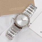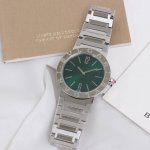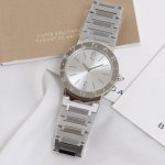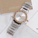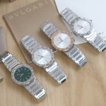 In stock: Diamond and Barrel-style Bulgari ladies' quartz watch. This watch uses the Bulgari logo as its design element. The 316L case features a unique double-ring engraving on the bezel, initially inspired by the curved inscriptions on ancient coins. The movement is assembled with original parts. Using the same movement and components at such a low price is incredibly cost-effective. It's an original-quality watch; the use of the original movement indicates its exquisite craftsmanship and high quality. Two styles and four color options are available. The diamond version features a dial with 12 1.0-inch natural diamonds, while the barrel-style version has a dial with bar-shaped decorations. Both have a sunburst finish, sapphire crystal, and are set with natural pink jasper. The watch is 33mm in diameter, water-resistant to 50 meters, and comes with a unique serial number. It features a stainless steel bracelet with each link individually polished, showcasing a clear distinction between polished and sanded surfaces. The craftsmanship is complex. It comes with full packaging. A great gift or personal item.
