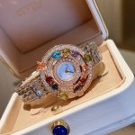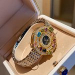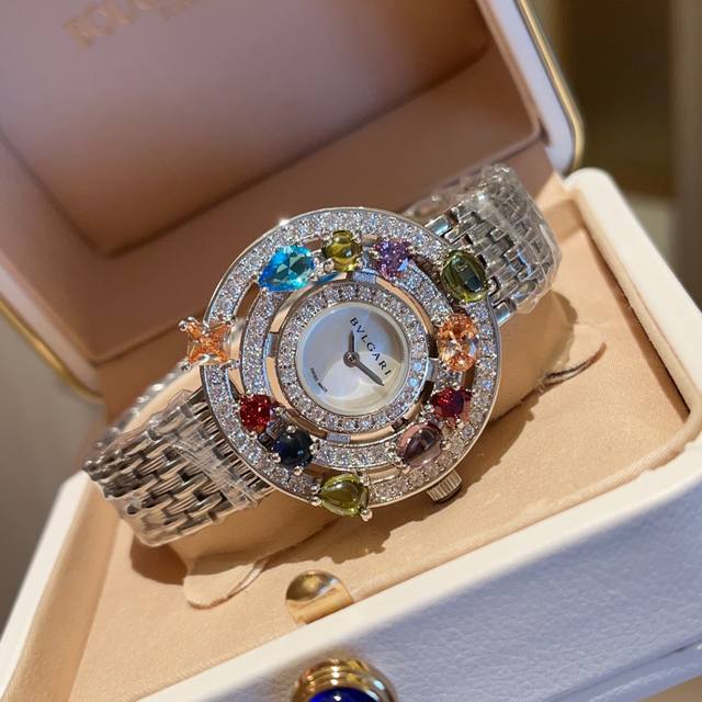 Bulgari's High Jewelry Collection exquisite watch, the entire watch uses a setting technique, with up to 10 colored gemstones surrounding three circles of cubic zirconia bezel, highlighting its extraordinary elegance. The dial is 36mm thick, the thickness is 8mm, it features an imported quartz movement, and comes with a silk strap and original exquisite buckle.