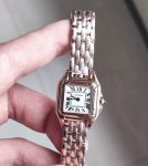 Cartier Panther women's watch, with its smooth lines and captivating charm, softly rests on the wrist, as if dancing on the skin . The unique square lines accentuate an elegant, confident, and captivating feminine image. It features a Swiss quartz movement, dimensions: 22 x 30 mm, a crown set with a blue spinel, a silver-plated dial, and sword-shaped blued steel hands. The overall design exudes an elegant yet fashionable beauty, making it a very versatile piece that can be worn with both formal and casual attire. #CartierPantherWomensWatch #CartierPanther #PantherSmall #CartierPantherWomensWatchSmall #PantherMini #CartierMiniPanther #CartierPantherMini #CartierPantherWatchDDD