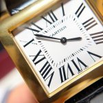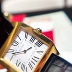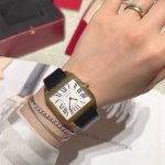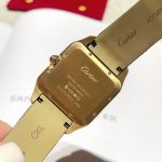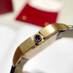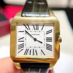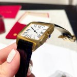 Cartier Santos Dumont - Classic Leather Strap Square Watch in Gold (Same Price for Sizes)! Women's dial diameter 38.5mm x 30.3mm, Men's dial diameter 44.6mm x 34.6mm. Ultra-thin 0.5mm thickness. Features a Swiss Eta quartz movement, ultra-strong sapphire crystal, rose gold square dial, Roman numeral hour markers, 316L stainless steel case, original stainless steel brushed folding clasp, and a dazzling French-imported high-gloss American alligator leather strap in black! Stylish and sophisticated!