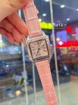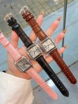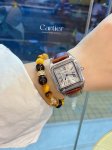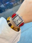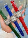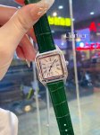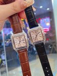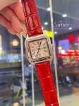 Santos-Dumont Cartier Ultra Thin Dumont Watch, a sophisticated ladies' watch, featuring a blue spinel crown, sunray-finish brushed finish, classic Roman numeral hour markers, a smooth dial with blued steel sword-shaped hands, a mineral crystal, and a calfskin strap.
