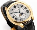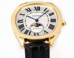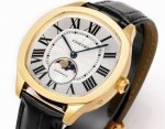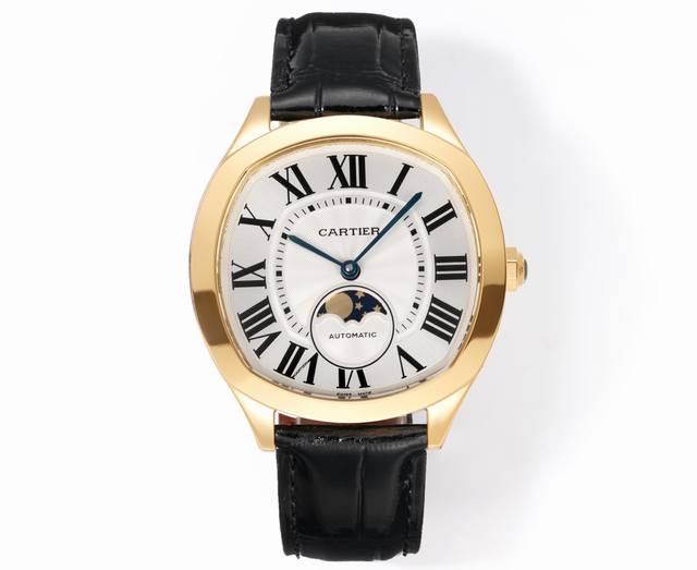 Cartier Drive De Cartier Af9 watch with a white and gold case. Its elegant, cushion-shaped design, paired with clean, streamlined lines, embodies a masculine and unyielding charm. The case measures 40mm x 41mm x 12.5mm. The unique cushion-shaped case is exceptionally well-made, and the sapphire crystal's clear, full, curved lines are perfectly replicated. Continuous refinement ensures a true-to-the-original experience for all. This technological breakthrough features the original Caliber 1904-ps Mc movement. The rotor and bridges are rhodium-plated, and the balance wheel is positioned to match the authentic, achieving a level of authenticity that rivals that of a store-bought watch. Highlights: 1. Exclusively sourced from the original mold; 2. The quenched, blued hands are full and three-dimensional; 3. The dial features a delicate, harmonious, classic button-lock pattern; 4. The 12 Roman numerals are printed in a superimposed pattern, creating a smooth, neat effect. Calm and restrained, with exquisite craftsmanship, it adds a unique touch to your wrist. S1 exquisitely recommends men's two-hand moon phase mechanical watch
