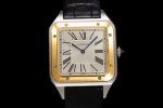 Santos-Dumont 2025 Large Size Latest Colorway - Counter-Synchronized Aluminum-Magnesium Alloy Solid Grain Strap. Synchronized with the original, this model improves upon the peeling and uneven tension issues of the older solid grain strap. 1:1 original mold, a drop-in replacement. Available in large, medium, and small sizes. The large size offers a custom manual-winding mechanical movement or a Swiss quartz with a Caliber platinum plate. The medium and small sizes feature a Swiss quartz movement with a Caliber platinum plate. Large: 46.6 x 33.9 mm, Medium: 43.5 x 31.4 mm, thickness 7.3 mm; Small: 38 x 27.5 mm, thickness 7.3 mm.