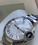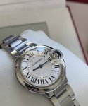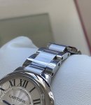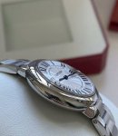 This Cartier watch features a bright silver case, a sleek round dial, a classic 33mm case diameter, a 316L stainless steel strap, a sapphire crystal, and a silver-plated, pearlescent guilloch
