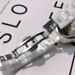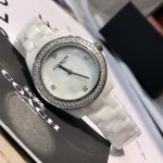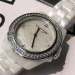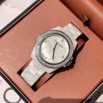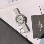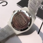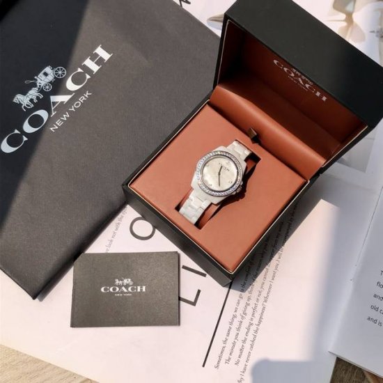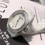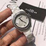 Coach's Ceramic Collection has a new addition! This 32mm diameter quartz watch features a smooth and comfortable ceramic case with a delicate mother-of-pearl dial adorned with a subtle tea rose print