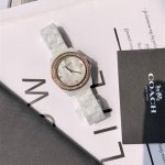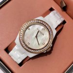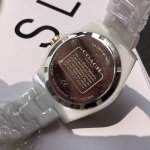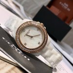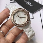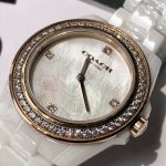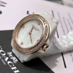Coach's Ceramic Collection has a new addition! This 32mm diameter quartz watch features a smooth and comfortable ceramic case with a delicate mother-of-pearl dial adorned with a subtle tea rose print