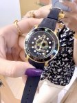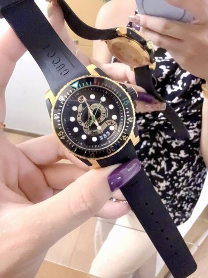 Gold 390 upgraded version, original quality. Gucci's new unisex dive watch, 40mm case diameter, features the brand's iconic "cat" motif and luminous display on the dial. Made of stainless steel with a satin-brushed finish, it comes with a rubber strap matching the dial color. The unidirectional rotating bezel is decorated with luminous hour markers for a dive countdown. Swiss Eta quartz movement, water-resistant to 50 meters. In stock.