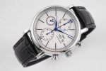 Tw presents the Iwc Portofino Chronograph watch. The watch measures 42mm x 13.5mm. Perfectly synchronized, the case is crafted from stainless steel, meticulously polished to a fine luster. The lugs have a natural curve, seamlessly blending with the case, creating smooth lines and a radiant shine. Inside, the watch is powered by a modified 7750 Cal. 79320 automatic mechanical movement, achieving complete functionality identical to the original. It features a closed case back with an engraved anniversary logo, and is finished with an Italian calfskin strap and pin buckle, making it easy to wear and aesthetically pleasing. Tw's Iwc Portofino Chronograph vividly interprets the timeless classic of the Portofino. We welcome all watch enthusiasts to appreciate it.