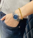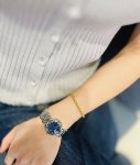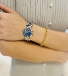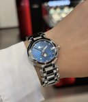 This Longines "Blue Moonlight" watch is such a perfect match for my outfit! Who can resist? Who could look away from this watch? The Longines Moonlight Blue mother-of-pearl dial on this young lady's wrist is simply a stroke of genius in her outfit. The natural mother-of-pearl dial is amazing; it shimmers with a delicate iridescent sheen under the light, as if it's infused with fragments of moonlight and starlight. Paired with the signature blue accents, it's both gentle and sophisticated. Whether paired with a simple shirt or a flowing skirt, it blends seamlessly, instantly elevating the overall look. The moment she raises her wrist, she exudes both the warm luster of mother-of-pearl and understated elegance