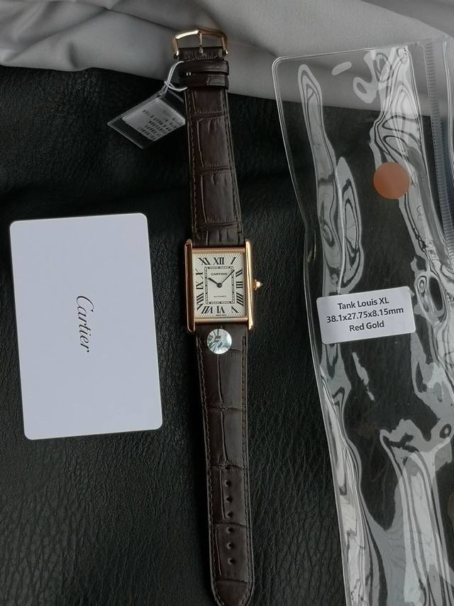 F1 Factory's 2025 year-end masterpiece! A 1:1 precision replica of the original! The latest generation Cartier Tank Louis XL Automatic watch, measuring 38.1*27.75*8.18mm. It comes with a custom-made Asian version 2899Mc automatic mechanical movement! Available in rose gold and yellow gold, with calfskin and alligator leather options! The latest 2025 Cartier Tank Louis Automatic, a new large model, continues the rectangular aesthetic! This is the first Tank LC watch in nearly 50 years to feature an automatic mechanical movement. In terms of aesthetic design, the new watch is largely consistent with the familiar and beloved previous generation of the LC series: blued steel hour and minute hands, a classic semi-matte alligator leather strap, and a beaded crown set with a cabochon sapphire that matches the case. The most obvious difference between the new and old models is the unique sunburst dial, a pattern quite different from the familiar Cartier dial treatment, perhaps hinting at an automatic movement inside. With a classic size of 38.1*27.75mm and a custom-made 1899Mc thin movement from the F1 factory, the overall case thickness is only 8.18mm. The watch has a graceful and elegant feel, suitable for both men and women!