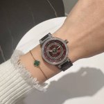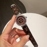Louis Vuitton, sapphire crystal, Swiss movement. The Monogram flower on the dial is not merely a simple decorative pattern, but an essential element of this timepiece. The petals are set with diamonds, and the perfect interplay of curves and diamonds creates a lifelike three-dimensional effect, as if swaying and dancing in the light. The interplay of contrasting curves, the Monogram flower pattern, and the sparkling diamonds makes this ladies' watch the perfect accessory for the discerning woman's everyday life.