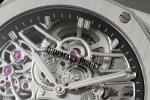 1. The open skeleton structure forms the main body. The entire dial lacks a clearly solid surface, instead using the rhodium-colored skeletonized movement as a background, creating a strong three-dimensional effect. The gears, bridges, and tourbillon structure are visible through the front, exhibiting a strong mechanical feel. It achieves a high standard in both structural complexity and visual appeal.