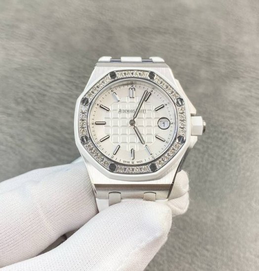 Audemars Piguet Ap87800 Royal Oak Offshore Series! Genuine Diamond Edition! 37mm Diameter, Quartz Women's Watch, Swiss Imported Quartz Movement . This Audemars Piguet women's watch not only possesses the rugged and powerful style of a men's watch but also adds a touch of femininity, making the timepiece more fashionable and individualistic. It is also one of the most popular Audemars Piguet women's watches currently available! The 904L stainless steel case is set with 32 brilliant-cut diamonds, each 2.05mm in size, totaling approximately 1.02 carats, providing an extraordinary tactile and visual experience and presenting a dazzling luster. This is the attitude of true elegance. The strap is made of white silicone, an EU-certified environmentally friendly material. It can be easily cleaned with water or wiped with a damp paper towel. Actual product photos.