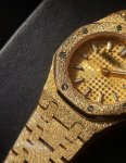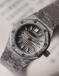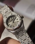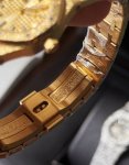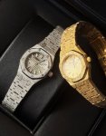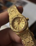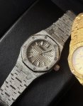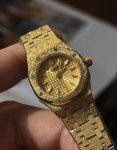 Audemars Piguet Mini Royal Oak Frosted Gold Quartz Watch! This watch is currently incredibly popular, a perfect mini watch to pair with high-end jewelry, creating a luxurious look when layered. Who can resist this Audemars Piguet Mini Royal Oak 67630Ba in frosted gold? It exudes ultimate elegance! The dial has a delicate aventurine texture that shimmers under light, perfectly complementing the classic octagonal case. The full gold bracelet has a brushed finish, offering a subtle texture that avoids the gaudiness of a polished finish. It perfectly balances the Royal Oak's robustness with feminine grace, effortlessly radiating sophistication. It's an all-around versatile watch, suitable for both work and dates; this time, elegance is truly ingrained in our DNA. The DDD features a Swiss quartz movement, a classic octagonal case, and inherits the iconic genes of the Royal Oak. It's plated with 18K gold