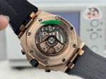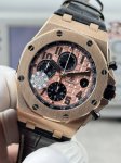 Audemars Piguet Royal Oak 26238 with rubber, leather, and steel straps. Featuring a small seconds sub-seconds at 12 o'clock, this popular 42mm case exudes both grandeur and sophistication. The dial boasts a "Mega Tapisserie" pattern, a classic Audemars Piguet design element, complemented by three-sided brushed luminous hands for excellent legibility in the dark. Powered by the Dandong chronograph 3126 automatic movement with a 0.5-hour vibration frequency, the watch features a double-sided sapphire crystal with high transparency and anti-reflective properties. The case is finished with CNC brushing, showcasing meticulous attention to detail. All hexagonal screws on the bezel are on the same plane. The watch is available with either a rubber or steel strap. Water resistant enough for everyday handwashing, rain, and even swimming, this Audemars Piguet Royal Oak Offshore 26238 is a worthy addition to any collection. Welcome to experience it!