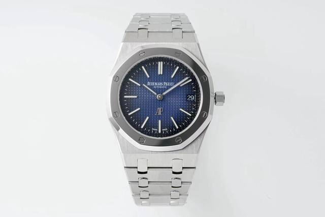 B7 Factory's annual grand finale: Audemars Piguet Royal Oak 15202 A, pushing the style of the "King of Steel" to new heights. The 39mm diameter case, ultra-thin 9mm thickness, and classic octagonal bezel with polished finish add a touch of softness to its masculine design. It features an anti-reflective sapphire crystal glass and case back, and is water-resistant to 50 meters. The dial shines brightly even in low light, representing another technological breakthrough for B7. It features a "Tite Tasserie" pattern, luminescent white gold applied hour markers, and Royal Oak luminescent hands