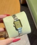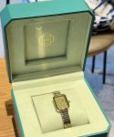 I'm so moved by this little green sugar cube! Green really makes my skin look so fair! The grass-green square dial has a beautiful sheen. It looks so elegant with the gold strap. It makes my skin look so fair when I wear it.