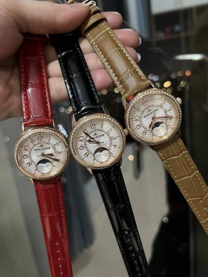 Jaeger-LeCoultre Rendez-Vous ladies' watch, one of the three great dreams of women. A high-quality Jaeger-LeCoultre Rendez-Vous series women's watch with moon and stars display, imported quartz movement, original folding clasp stainless steel bracelet, dimensions 33mm wide and 10mm thick.