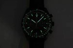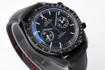 Speedmaster Series Dark Side of the Moon Chronograph Men's Watch features a stable original 9300 automatic movement. The 3 o'clock dial displays the 12-hour time, and the 9 o'clock dial displays the chronograph seconds. 1. The case thickness is 17.2mm, consistent with the original. 2. The case lugs are more delicate and elegant. 3. The bezel lettering is clearer, more prominent, and more three-dimensional. The double-sided convex crystal has super strong luminescence, perfectly replicating the original mold.