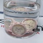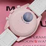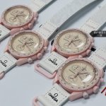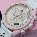Swatch Collaboration DDD Model 3, Venus Pink. Quality assured. Affordable price. This Swatch collaboration watch boasts a striking design, with a white Velcro strap perfectly complementing the soft pink hue. The oval sub-dial is adorned with diamond-like details, adding a touch of feminine elegance. The hour, minute, chronograph seconds, and counter hands are all pink. Case and dial are identical to the official design. Subtle pattern at 6 o'clock is identical to the official design. The central "S" on the crystal is identical to the official design. Battery at 12 o'clock on the case back is identical to the official design. High water resistance. Official protective film. High-intensity luminescence. All dials feature the X Swatch brand logo, the classic Speedmaster logo, and the new Moonswatch logo. All models are crafted from crystal glass; the Biocerc material provides a unique and delicate tactile experience. The outer bezel and subdials are adorned with a delicate circular pattern, while the stylish and eye-catching lugs and the signature "Dot Over 90" detail on the tachymeter bezel showcase high quality in every detail. All hour, minute, chronograph seconds, and hour markers are coated with Super-Luminova for excellent legibility even in the dark.