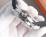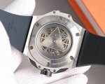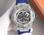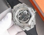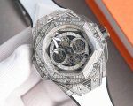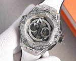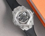 Hublot's new Big Bang Sang Bleu II "Tattoo" watch, featuring a full set of diamonds and a striking design, once again collaborates with renowned tattoo studio Sang Bleu to release another watch with a cleverly conceived geometric design, perfectly embodying the brand's ambition and design philosophy. The Tattoo II watch utilizes more refined lines to create a vivid three-dimensional visual experience. The 45mm case diameter features graphic elements that run throughout the case, integrated into the hexagonal bezel through cutting and engraving. Six H-shaped titanium screws securely hold the bezel in place. The lugs have a strong design sense, with steep angles and sharp lines. The most eye-catching features of the dial are the diamond-shaped hour and minute hands and two hexagonal subdials, which create a unique geometric pattern visual effect as time passes. The black rubber strap presents a three-dimensional visual experience with geometric lines. Easy-to-use folding clasp, titanium inner case back, satin-finished skeletonized hands, anti-reflective multi-faceted sapphire crystal that will never scratch, and imported fluoroelastomer strap for enhanced comfort.