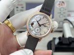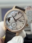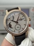 Vacheron Constantin Patrimony Moon Phase Watch features a 36mm round white gold case, with the bezel, lugs, and crown set with 81 diamonds totaling approximately 1.2 carats. The white mother-of-pearl dial is adorned with the most poetic moon phase display among all the complications of high-end watchmaking. The watch is powered by a movement developed and manufactured in-house by Vacheron Constantin, offering a power reserve of approximately 72 hours, providing ample power for the hours, minutes, small seconds, and moon phase displays.