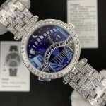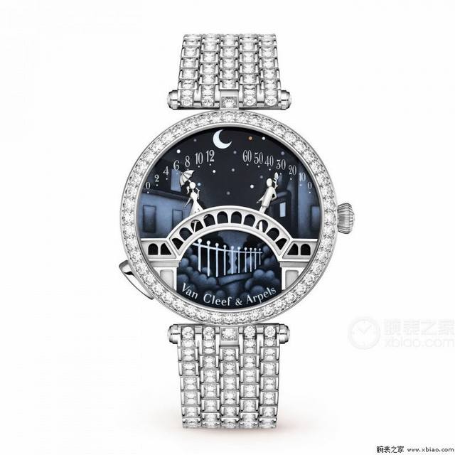 Van Eef & Arpels Lovers' Bridge, a new model with a matching case, the best value version! DDD Poetic Complications Series: The most romantic watch from the Lovers' Bridge series. DDD Custom quartz movement. DDD Sapphire crystal. DDD Case diameter approximately 38mm, thickness approximately 9mm. DDD 316L steel case, bezel set with diamonds and crystals. DDD The girl's hand is the hour hand, the boy's hand is the minute hand; the hour and minute hands meet and kiss every 12 o'clock. You can also press button A for 1 second to see the kissing moment. DDD