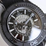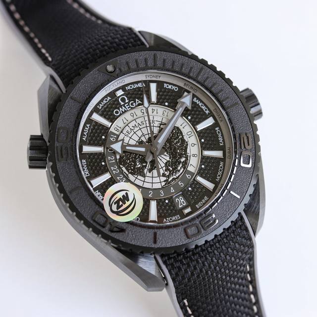 Zw Factory R63. A Brand New "All-Ceramic" 600-Meter World Time! The Seamaster Planet Ocean World Time Watch! DDD presents the new Seamaster Planet Ocean World Time Watch. Inspired by global travel, the new watch follows the classic design style of the famous Deep Sea Black watch, featuring a 45.5mm case made of black ceramic dioxide and a water resistance of up to 600 meters. The central dial features a bird's-eye view of the Earth, crafted from Grade 5 titanium, with the land outline engraved using laser ablation technology and finished with a lacquer. The inner dial has a 24-hour scale ring on the outer side, distinguishing between night and day. The Master Chronometer-certified 8938 movement is clearly visible beneath the case back.