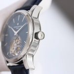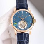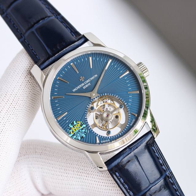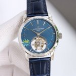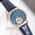 Vacheron Constantin's new Traditionnelle Tourbillon watch features a fresh take on a classic design, showcasing the harmonious fusion of watchmaking tradition and modern aesthetics. The captivating dark green sunburst dial, paired with white gold baton-shaped hour markers and sword-shaped hands, creates a striking contrast. The tourbillon at six o'clock rotates 360
