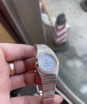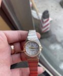 Omega Constellation Gold Double Eagle Women's Watch, 24mm Dial, Natural Mother-of-Pearl, VVS Natural Diamond Markers, VVS Natural Diamond Bezel, Original Diamond-Set Sapphire Crystal, Powered by Omega Cal. 1376 Swiss Original Quartz Movement, Eight-Digit Steel Stamp on Case Back (ID Number 59551104 Clearly Visible), Entire Watch is Original, All Gold Parts are Solid 18K Gold, Never Fades, Price 61,100, In Stock, Enlarged Discount 16,750 DDD