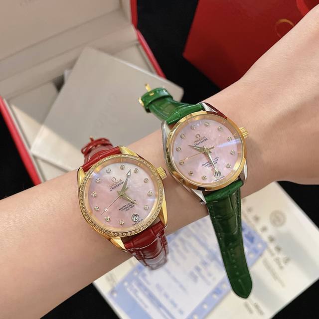 Omega Seamaster Series Ladies' Mechanical Watch with Diamond Design, Imported Citizen 8215 Movement, 316L Stainless Steel Case, Sapphire Crystal, 33mm Diameter, 11mm Thickness, Genuine Leather Strap with Original Pin Buckle, Exuding Noble Luxury and Elegance.