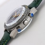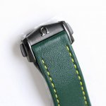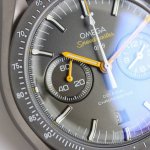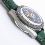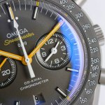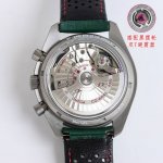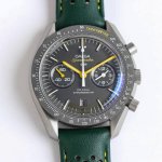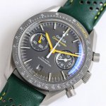 Tvs Factory's pioneering work, the Omega Speedmaster Dark Side of the Moon watch 311.92.44.51.99 1 DDD 44.25mm Co-Axial Chronograph, featuring the in-house developed 9300 movement with a 12-hour and 60-minute chronograph sub-dial at 3 o'clock. All functions and appearance are faithfully reproduced from the original 1-1. DDD Movement: 9300 double-T black balance wheel, automatic winding Co-Axial Master Chronometer movement, rhodium-plated surface decorated with a special Arabic-style Geneva stripe DDD Bezel: Grey ceramic bezel with super luminous material DDD Dial: Made of polished black ceramic, the inner rings of the subdials at 3 and 9 o'clock are blackened, paired with white gold hour markers DDD Case: Grey DDD Strap: Green leather strap DDD Crystal: Double-glazed scratch-resistant crystal DDD Functions: Date display, chronograph DDD
