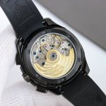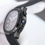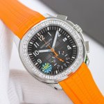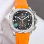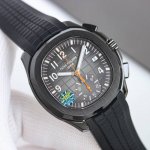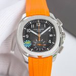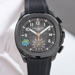 2410Mma - Patek Philippe Aquanaut series, Aquanaut watch model: 5968A-001 P. Features a stainless steel case, chronograph hands, peripheral railway-style markers accurate to a quarter second, and a 60-minute chronograph counter. The stainless steel case is paired with a rubber strap, exuding a stylish and sporty vibe. The case adopts the classic silhouette of a rounded octagonal bezel, which is further refined after beveling and polishing. The lugs, polished on the front and brushed on the sides, are slightly curved, presenting a natural arc, allowing the watch to fit the wearer's wrist more closely. (Note: The last sentence appears to be promotional material and not part of the product description.)